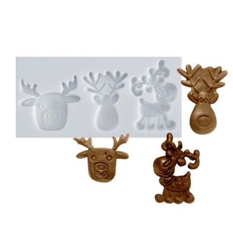 Vidám szarvasokat mintázó szilikon fondant és marcipán forma, mellyel igazán egyedi karácsonyi díszítéseket készíthetsz. Formával készített bájos szarvasokkal feldobhatod tortáidat, cupcake-jeidet vagy más ünnepi finomságaidat is. A forma használata egys