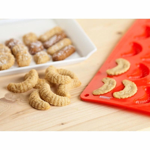 CULINARIA Red 30 darabos szilikon kifliforma, a forma mérete: 35 x 25 x 1,3 cm A forma hőálló (240 °C hőmérsékletig), nem köti meg az ételek ízét és illatát, könnyen karbantartható (mosogatógépben mosható). A szilikon egy olyan rendkívül közkedvelt anyag, mely egyedülálló tulajdonságainak köszönhetően konyhai alkalmazásra is kiválóan alkalmas. Különböző sütőformák