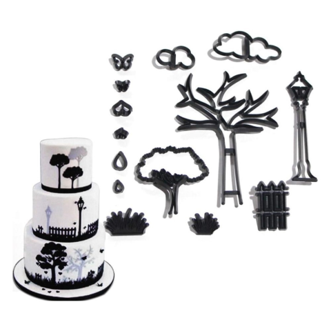Tulajdonságok: Anyaga: műanyag Mérete: Lásd képen Téma: Park (fák, lámpa, pillangó, stb.) Használat: Sütemények, fondant, marcipán formázásához, illetve kreatív projektekhez Varázsolj lenyűgöző süteményeket és dekorációkat ezzel a park témájú sziluett
