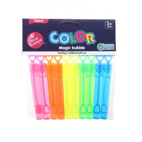 Neon színű rudak.Szívecske a fújóka végén.10 db buborékfújó.Kiváló választás gyerekeknek és örök fiataloknak. A Színes buborékfújó rúd szett egy fantasztikus és szórakoztató játékkészlet minden korosztály számára. Egy csomagolás 10 db 5 ml-es buborékfolya