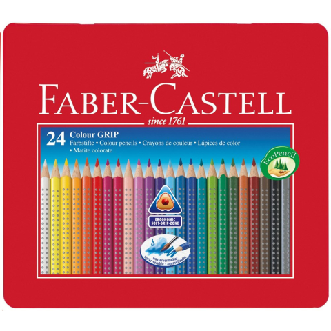 Színes ceruza FABER-CASTELL Grip háromszögletű fémdobozos 24 darabos Színes ceruza készlet. Ergonomikus háromszög forma. Késlelteti az ujjak fáradságát. Grip zóna megakadályozza az ujjak elcsúszását. Jobb és balkezeseknek egyaránt használható. Spe