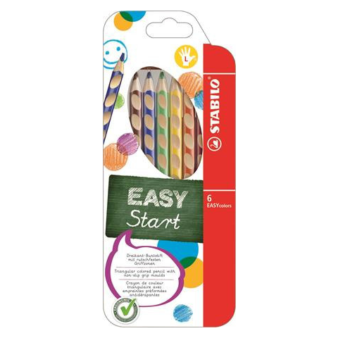 Színes ceruza készlet, háromszögletű, balkezes, STABILO EasyColours, 6 különböző szín - ergonomikus, háromszögletű, vastag test - ceruzavégen sárga és piros festés a jobb- és balkezes változat megkülönböztetésére - szennyeződést gátló lakk a fogózóná