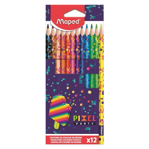 Színes ceruza készlet, háromszögletű, MAPED Pixel Party, 12 különböző szín A Maped Pixel Party kollekciójával egy retro-futurisztikus környezetbe csöppenhetünk, mely fiúknak és lányoknak egyaránt vonzó világot jelent. -pixel mintával díszített ceruz