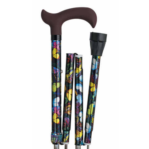 Fashion összecsukható bot. A kényelmes Derby fogantyú egy erős alumínium tengelyre van felszerelve, gyönyörű mintával díszítve. Bot magassága nyomógombbal egyszerűen állítható. Egyszerűen, 4 részre összecsukható és könnyen kinyitható, kis helyet foglal. B
