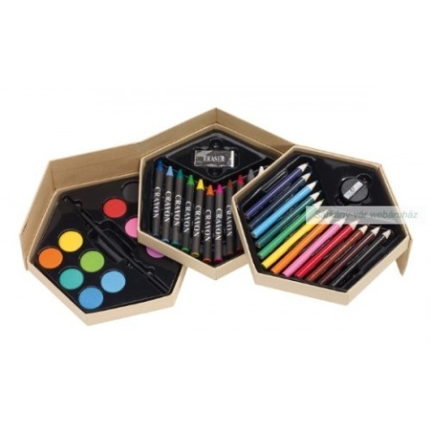 Színező és festő készlet többféle színező technika, megannyi színben: 12 db vízfestékkel, ecsettel, 12 db zsírkrétával, 12 db színes ceruzával (kihegyezve) és radírral, faragóval, 3 szintes kihajtható kartonpapír dobozban Méret: Ø18 x 9 x 7 cm Rendelé