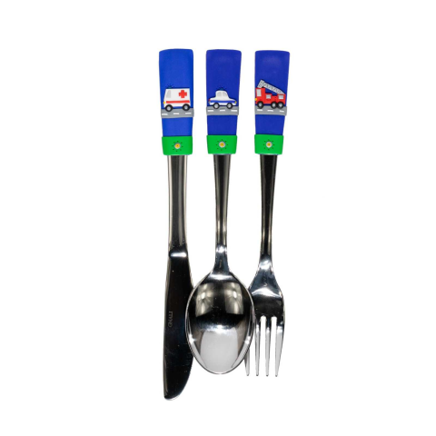 Szirénázó autós evőeszköz szettRendőr, tűzoltó, mentő kék alapon. A termékek alapanyaga kiváló minőségű (olasz Gnali márkájú) rozsdamentes acél evőeszköz és polymer clay, hőre keményedő lágyított műanyag díszítés.Meleg ételt italt lehet vele enni, keverni, de a 100 fokos forróvízben megpuhul a gyurma. Meleg helyen hagyhatjuk, de a forró vízben ne!Ha leesik az evőeszköz (kőre, a sarkával), eltörhet a műanyag díszítés. Nem kell rögtön kétségbe