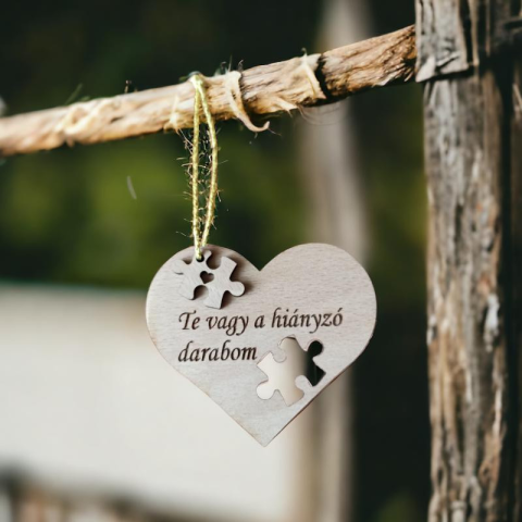 Gravírozott, lézervágott szív alakú fa függő. Mérete: kb 10 cm széles.