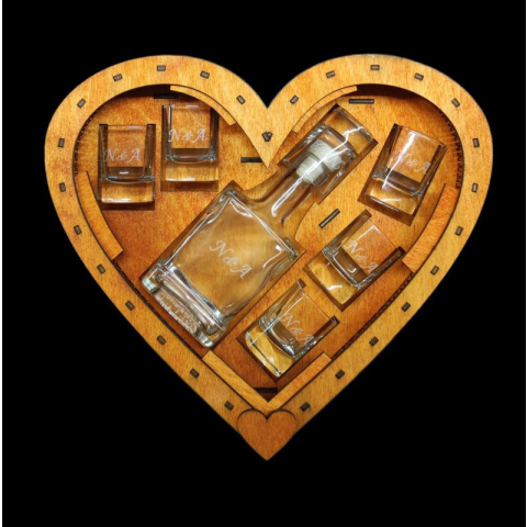 Szív alakú italos, fa pácolt doboz szett. Lézervágott és gravírozott 3 mm-es rétegelt lemezből. A doboz tartalmaz 6 db poharat és egy üvegpalackot. Üveg űrtartalma 2dl Poharak űrtartalma 0,55 dl Nem kell külön díszítő csomagolás hozzá, hiszen a doboz mag