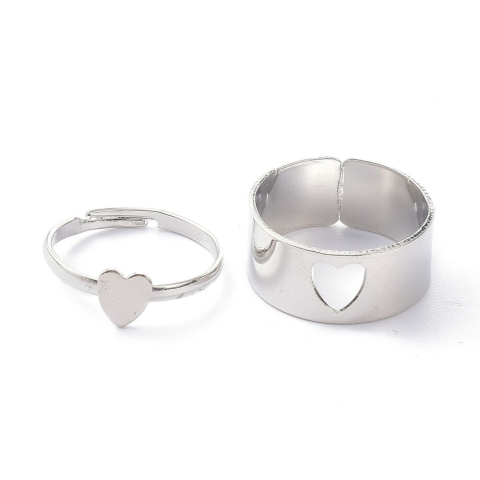 Szív motívumos páros gyűrű (2 db). Állítható méret. Széles gyűrű belső átmérő 17 mm, szélessége 9 mm, Szív 5.5x6x1.5 mm. Keskeny gyűrű belső átmérő 17 mm, szélessége 2 mm, Szív 5.5x6x1.5 mm. Anyaga fémötvözet. Nem orvosi ac