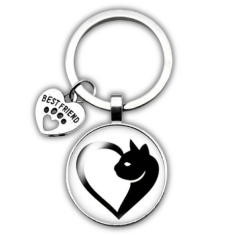 Cicás kulcstartó szív alakú és üveges medállal, tökéletes ajándék macskabarátoknak. Praktikus, stílusos és tartós kiegészít