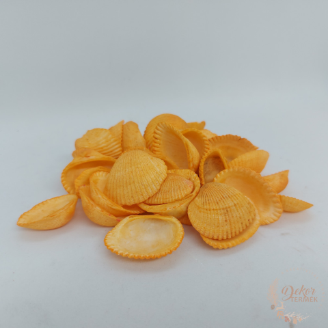 3-5 cm-es kagylók. Egy csomag 100 gramm, ami a képen látható mennyiség. (kb. 14 db). Szín: narancs Tömeg: 100 gramm Kagylók nyári, tengerparti hangulatú dekorációk, kopogtatók, asztali díszek készítéséhez, vagy akár akvárium, kerti dekoráció színesítés
