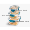 Patentzáras, kocka alakú, 3 darabos ételtároló doboz szett. A pattintható fülekkel záródó, szilikontömítéssel ellátott tető légmentesen zár. A tárolódobozok átlátszó műanyagból készültek, így a tartalmuk felnyitás nélkül is látható. Mikrohullámú sütőben,