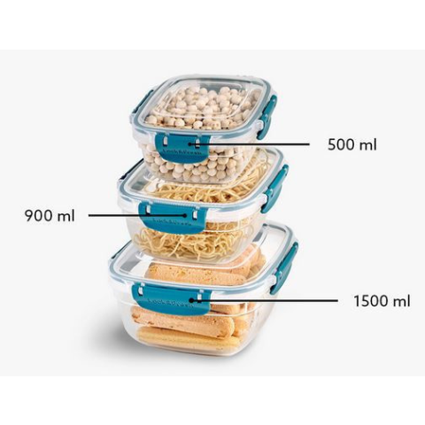Patentzáras, kocka alakú, 3 darabos ételtároló doboz szett. A pattintható fülekkel záródó, szilikontömítéssel ellátott tető légmentesen zár. A tárolódobozok átlátszó műanyagból készültek, így a tartalmuk felnyitás nélkül is látható. Mikrohullámú sütőben,