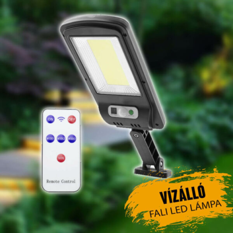 Falra szerelhető napelemes LED lámpa, hozzá tartozó IR távirányítóval és mozgásérzékelő funkcióval, 5W teljesítményben elérhető termék. A fali lámpa beépített akkumulátorral van ellátva.