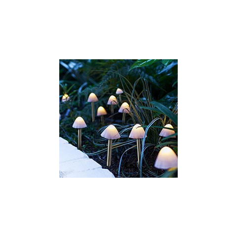 12 db-os mini gomba solar LED lámpa, meleg fehér Ez az aranyos 12 db-ból álló mini gomba család, egy álló napelemes LED lámpa szett, amely varázslatos hangulatot teremt az éjszaka kertjében. A mini gombák fém szárait szúrja le az önnek megfelelő magasságban, majd a napelemes központi egységet is. A szolár panel egység a rejtett elhelyezés érdekében 90 cm hosszú vezetékkel rendelkezik, míg a gombák között 25 cm kábel áll rendelkezésre, így kellő teret