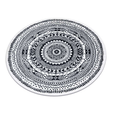 Fehér-fekete Mandala mintás kerek szőnyeg - 160 cm átmérőjű Ez a gyönyörű, 160 cm átmérőjű kerek szőnyeg modern és stílusos kiegészítője lehet otthonának. A fekete-fehér mandala minta időtlen eleganciát sugároz, és bármilyen enteriőrbe könnyedén beil...