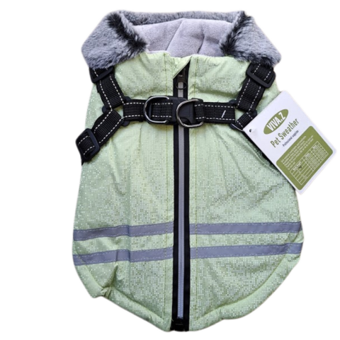 1 kép Szőrmegalléros Fényvisszaverő Kutyakabát Beépített Kutyahámmal, zöld, M-es