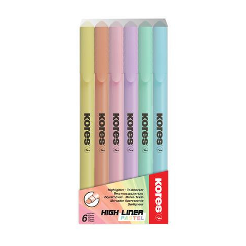 Szövegkiemelő készlet, 0,5-5 mm, KORES, 6 különböző pasztell szín Szövegkiemelők KORES minőségben! -magas minőségű, toll formájú szövegkiemelő vágott heggyel és egyedi designnal -univerzális vízbázisú tinta, minden típusú papírhoz -több tintával a hos