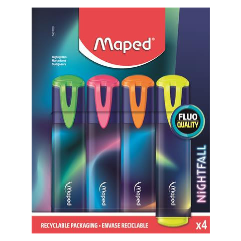 Szövegkiemelő készlet, 1-5 mm, MAPED Nightfall, 4 különböző szín Nightfall kollekció - lélegzetelállító megjelenéssel emelje ki a lényeget! -puha, vágott hegy -élénk színek -egyenletes tintaadagolás -nyomtatott, metálfényű fóliával díszített test -ti