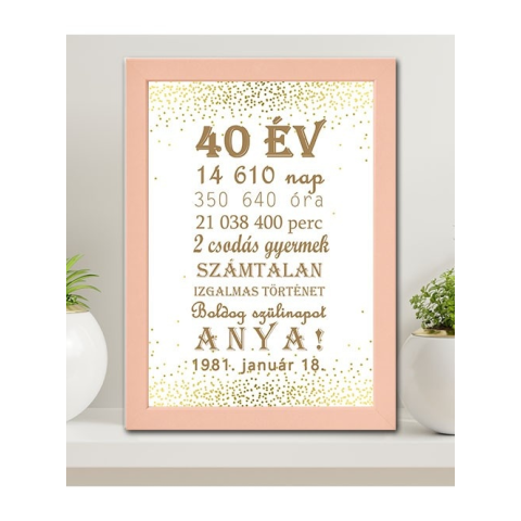 Születésnapi ajándék anyának, Boldog szülinapot Anya falikép egyedi dátummal, felirattal. A képkeret színe, és a szöveg háttere választható ezzel is még személyesebbé teheted ezt a különleges faliképet. Falra akasztható, vagy kitámasztójának köszönhetően