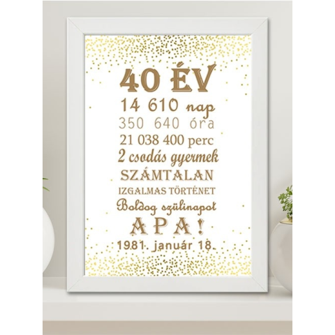 Születésnapi ajándék apának, Boldog szülinapot Apa falikép egyedi dátummal, felirattal nagyobb, A3 méretben, A képkeret színe és a szöveg háttere fehér. Falra akasztható, mérete 30x40 cm