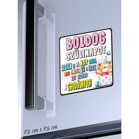 Ajándék születésnapra, hűtőmágnes szülinapra. Boldog szülinapot! Legyen ez a nap olyan, mint amilyen Te is vagy, egy szóval: Csodálatos! Anyaga: műanyag, hátoldalán mágnes csíkkal Mérete: 7,5 x 7,5 cm, 0,3 cm vastag