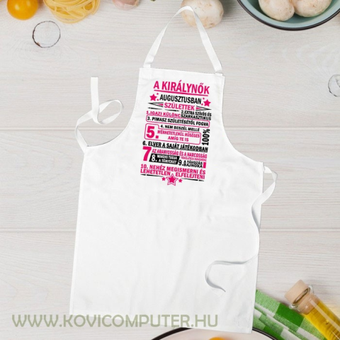 Egyedi szülinapi kötény, ajándék királynőnek. Vicces feliratos kötény nőknek, lányoknak születésnapra, szülinapi ajándék választható születési hónappal. Egy igazi királynőnek kötelező viselet a szülinapi bulin. Fekete vagy fehér színben is rendelhető, a k