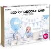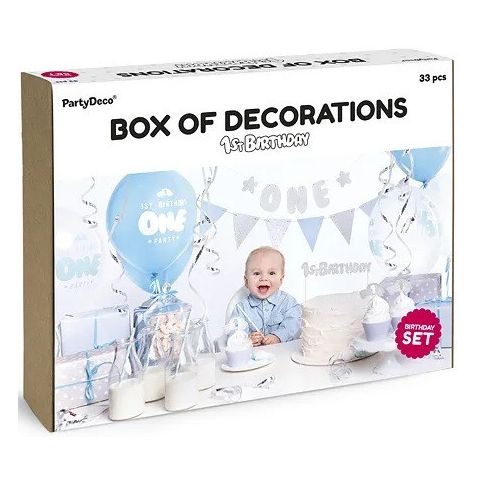 Első születésnapi dekorációk doboza - transzparens, füzér, tortadísz, szalmaszálak, lufik, léggömbök, szalagok, szalag és cupcake-díszek. A készlet minden bulit másvilági hangulatúvá varázsol! Elemek száma: 1 db: Szín: kék és ezü