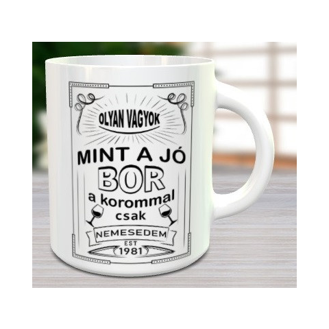 Szülinapi bögre, korommal csak nemesedem. Olyan vagyok, mint a jó bor, a korommal csak nemesedem vicces feliratos bögre bor kedvelő férfiaknak és nőknek születésnapra. Ne felejtsd el megadni a születési évet ami a termékre fog kerülni. A minta tartós, nem