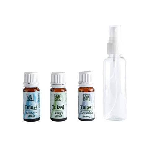 A csomag tartalma: Tulasi citromfű illóolaj, 10ml Tulasi borsmenta illóolaj, 10ml Tulasi levendula illóolaj, 10ml 60ml-es szórófejes flakon A recept a lenti ismertetőben szerepel
