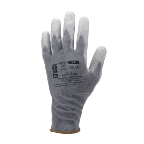 SZÜRKE PRECÍZIÓS POLIÉSZTER KESZTYŰ, PU MÁRTOTT TENYÉRREL_7 Szürke, varrás nélküli, poliészterrel erősített, 13-mas kötésű kesztyű, szürke poliuretánnal mártott tenyérrel és kötött mandzsettával.