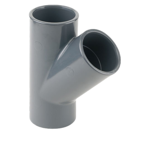T idom - 45º Kiváló minőségű, ragasztható, könnyű PVC-U T idom, nyomócsövekhez. Hosszú élettartam, kiemelkedő korrózióállóság és kopásállóság jellemzi. Felhasználhatósága egyszerű, összeszerelése praktikus és gyors. Műszaki adatok: Ív szöge: 45º PVC