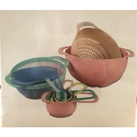 A pasztell színű műanyag szett tálat, szűrőket és mérőedényeket tartalmaz. A szett tartalma: 7,5 ml mérőedény 15 ml mérőedény 60 ml mérőedény 85 ml mérőedény 125 ml mérőedény 250 ml mérőedény 500 ml mérőedény 1,65 l szita 3 l szűrőtál 4 l keverőtál