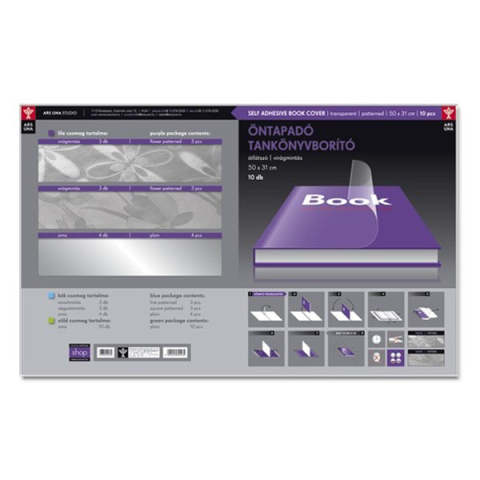 Tankönyvborító ARS UNA 50x33 cm öntapadós virágmintás Öntapadós műanyag tankönyvborító, 50x33 cm méretű. Egy csomag 10 db átlátszó borítót tartalmaz. Méretre vágható. Tankönyvekhez és füzetekhez is használható.