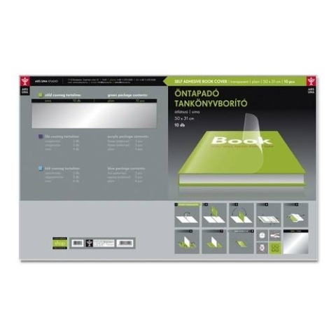 Öntapadós műanyag tankönyvborító, 50x33 cm méretű. Egy csomag 10 db átlátszó borítót tartalmaz. Méretre vágható. Tankönyvekhez és füzetekhez is használható.