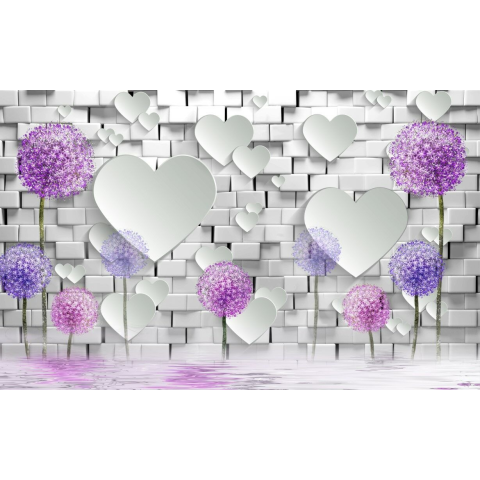 1 kép Tapéta lila pitypang, fehér téglafal, szívek, 400 x 250 cm