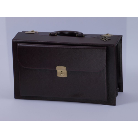 Rekeszes, harmonikaszerűbőr orvosi táska. A tetején levő csatok nyitásakor 3 táguló rekeszt találunk alatta. A táska oldalán található csatt egy további kisebb rekeszt nyit. Méret: 41,5X24X15-20 cm, (szél.Xmag.Xmélység) a 15 cm-es mélység 20 cm-re tágul b