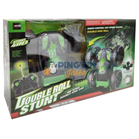 Zöld terepjáró, ami szaltót tud ugrani! A Távirányítós átfordulós autó egy fekete és zöld alapszínű, műanyag karosszériával készült autó, nagy kerekekkel.