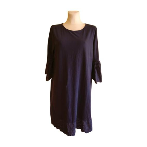 Ez a Tchibo sötétkék női ruha egy nagyon csinos, praktikus nyári darab. Anyaga puha pamut, amely jól szellőzik. Fazonja klasszikus, egyenes esésű szoknyával. A szegélyeit és az ujjakat finom madeira díszíti. Jól kombinálható bármilyen