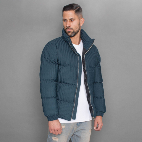 Regular Fit , normál fazonú, zöld színű magában mintás steppelt téli dzseki, két zsebbel , gumis kézelővel Modell: 185 cm/ 85 kg/ L-es méret