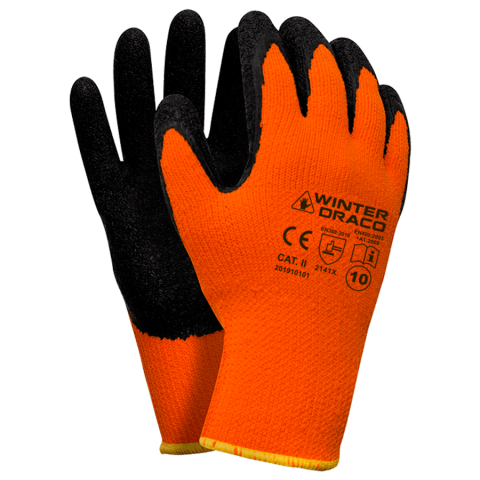 Szigetelt, bevonatos védőkesztyű, jó minőségű hurkos poliészter fonalból (7 Gauge), narancssárga színű. Tenyérbevonat nagyon tartós, gyűrött latexszel.