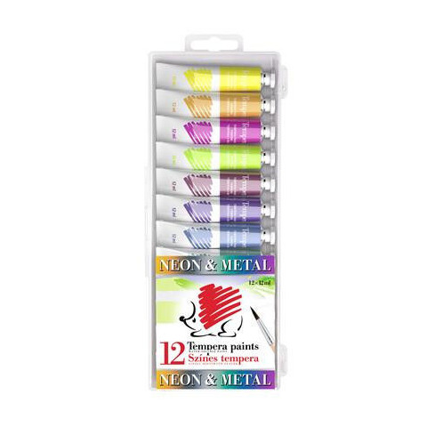 Tempera készlet, 12 darabos, ICO Süni, metál és neon színek Jól fedő, élénk színek, tubusos kiszerelés (12 ml/tubus). A készlet 12 féle színt tartalmaz (8 metál és 4 neon szín). Gyártó/első EU forgalmazó elérhetősége: ICO ZRT 2013 Pomáz, ICO út 5.; E