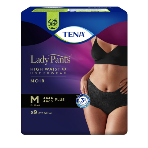 TENA Lady Pants Plus noir- fekete színű inkontinencia-fehérnemű magasított derékrésszel - 9 db Női inkontinenciafehérnemű, elegáns fekete színben és magasított derékrésszel, középsúlyos vizeletvesztési probléma esetére. TENA Lady Pants Plus Noir - fek
