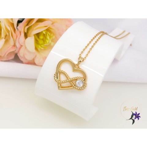 Antiallergén gyönyörű medálos nyaklánc Szív alakon egy végtelen jel szimbólum kis fehér cirkóna kővel.Szin: 18K Méret: lánc 42+5 cm Medál:20x20mm