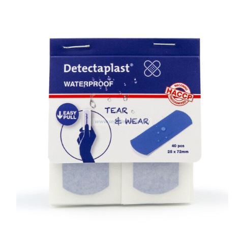 Megfelel a HACCP, IFS és BRC előírásoknak. Öt praktikus Easy-Pull csomagot tartalmazó doboz, amely egyenként 40 univerzális vízálló, kék érzékelős tapaszt tartalmaz. Tapasz mérete: 25 x 72mm A Detectaplast Universal tapaszok vízlepergetőek és szennyező