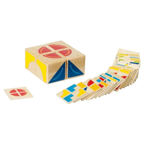 Rakd ki a feladatlapon szereplő alakzatokat a négy kockából! A festett fából készült kockák mérete: 8 x 8 x 4 cm, 26 feladatlappal.