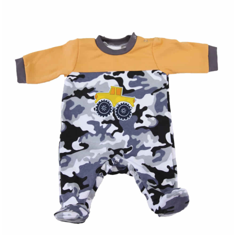 Terep színű traktoros mintával belül bolyhos baba rugdalózó Kisbabák ruhatárának praktikus alapdarabja ez a belül bolyhos, vállon patentos baba rugdalózó. Nagyon vagány ez a traktoros mintával nyomott baba rugdalózó minőségi, bababarát