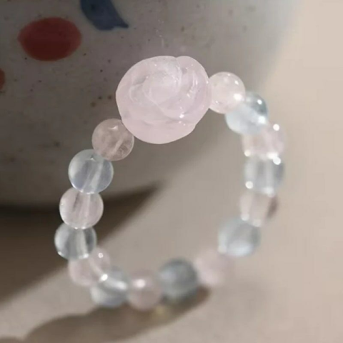 Főbb termékjellemzők: Anyag: természetes kövek - akvamarin, kristály, rózsakvarc Átmérő: 12 - 16 méret között állítható Szélesség: kb. 9,5 mm Tömeg: kb. 2,1 g Rózsagyűrű Egyedi, természetes kövekből készült gyűr...