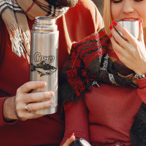 Halas ajándék, Carp termosz. Rajzolt stílusú, fekete ponty mintás termosz. Visszafogott, dekoratív termosz különleges születésnapi vagy névnapi ajándék lehet horgász férfiaknak és nőknek. Termosz űrtartalma 500ml vagy 750ml, anyaga fém és műanyag. A kupa