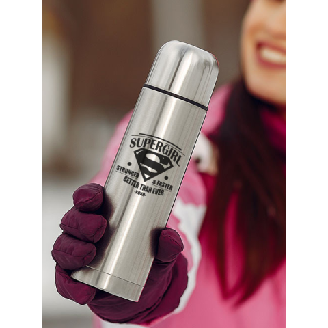 Termosz nyomtatás, Supergirl termosz. Erősebb, gyorsabb, jobb mint, valaha vagyis igazi szuper lány. Lepd meg egy igazi trendi termosszal barátnődet. Anyaga rozsda mentes acél és műanyag, 500ml-es és 750ml-es változatban elérhetőek. Stílusos és praktik